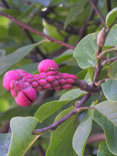 今日の写真はしばらく前にもアップしたコブシの実。果皮が剥けて種が露出していた。種を覗かせた姿もより一層グロテスクだ。この姿形では誰も食べようとは思わないだろうが、どうも毒まではないかも知れないが 食用は出来ないようだ。 | |