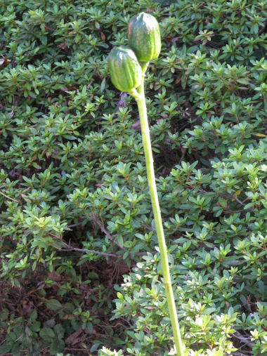 花が少なくなったので、暫く実の写真が続くかもしれないが。ウバユリの花は ここにアップしたが、これはその実。花も2輪だったから、無事どちらも受粉したんだろう。何となく昔 子供のころに遊んだロケット花火?か何かを思い出すような形。 2日ほど前に、最後かもしれないと書いた蝉の声だが、今日の夕方もまだ 1匹前の桜の木で鳴いていた。 | |