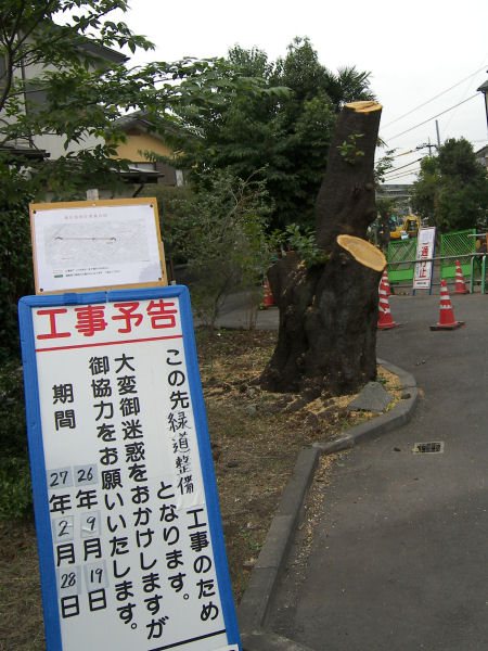 散歩道の工事開始の看板の写真は半月ほど前にアップしたが、いよいよ工事が始まり、今朝は桜の老木が切り倒されてしまった。おそらくは元々人間の手によって植林された100年以上の老木で、今までも大きな枝は何度となく切り落とされて来たんだろうけど、今度は根こそぎ倒されてしまう。自然界の「無常」を知らしめると共に、それ以上に害獣の頂点に位置する人間のご都合主義の「無情さ」を訴えかけるような切り口の白さが印象的だ。 ところで、1週間ほど前から発生していた Yahooのメールサーバの故障がやっと回復したようだ。3百数十万IDのメールが影響を受けたらしい。結構大きな障害だったが、目に付く範囲では新聞などで取り上げられているふしは無い。 | |