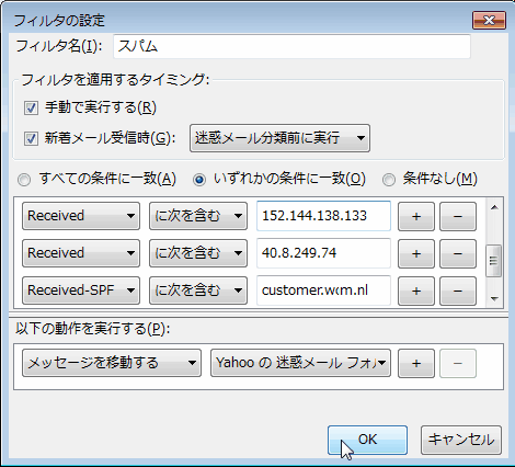 この間障害を起こした Yahooメールなんだが、もう一つ問題があって迷惑メールがドサッと来る。このアドレスはソフトのダウンロード時やネットサービスなどのユーザ登録時に必要なメールアドレスに使っているので、当初から多くの名簿業者に流出しているのは覚悟している。但し登録の確認のようにたまに必要なメールも入ったりするので、Thunderbirdの迷惑メールフィルターをかけて殆どの迷惑メールは直接迷惑メールフォルダに自動で移動しているが、最近フィルターをすり抜けるメールが増えてきたのが送信元を偽装したメール。  ほとんどはスカパーの無料視聴とか怪しげなDVD広告のものなんだが、偽装した送信元のメールアドレスはもちろんランダムな文字列だし件名も結構ばらばらで従来のフィルターではひっかけられないか、ひっかけるのが面倒なもの。そこでいろいろ検討した結果、それらのメールは 4つほどのメールサーバから発信されているらしいので、メールヘッダーの[Received]にある、最初の送信サーバーの情報でリジェクトする方法。具体的には新規メールフィルターを作成し、「件名」のリストの一番下の「カスタムヘッダ」を選択して、表示されるカスタムヘッダの追加画面で受信メールのヘッダ情報中の「Received」を追加する。 すると、「件名」リストの一番下に「Received」という項目が表示されるので、ここを選んで今度は迷惑メールのヘッダ情報中の 「Received」の中の一番下の右側の送信元サーバーなどから共通したものを探してそれを追加登録する。  今度の場合、メールサーバー名はなくて直接 IPアドレスが入っているので、その IPアドレスをリジェクトすればいいはず。具体的なヘッダー情報は Received from 18.98.128.86 by 217.23.6.24x; Sun, 05 Oct 2014 13:43:09 +0600 等となっているので 217.23.6.24xの部分を指定した。(xは数字一文字)或いは、メールによっては unkownなどになっているのでこちらも追加。 1~2日待ってみないと効果は分からないと思うが、多分行けるだろう。 (後日記入)その後経緯を見たが、このIPアドレスもランダムに偽装されているらしく効果はイマイチ。 そこで更に検討したところ、ヘッダー情報のさらに下の方にある [Received-SPF]と言う項目が偽装メールのチェックに使えるらしいことが分かった。この後ろが[none]となっていれば偽装の可能性が高いが、一部の正常メールの中にも同じサービスで異なった種類の案内を送信する場合にそのカテゴリーごとに送信元を変える場合などにも使われている様子。で、その後ろの [(xxxx.yyyy.jp: domain of zzzz@wwww.jp does not designate permitted sender hosts)]等となっているところを確認すると、何と殆どすべてのスパムは[xxxx.yyyy.jp]と言う同じドメインから送信されているらしい。そこで項目に[Received-SPF]を、検索ワードに[xxxx.yyyy.jp]の部分を指定することでほぼ確実にリジェクトできるようになった。