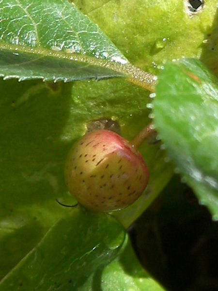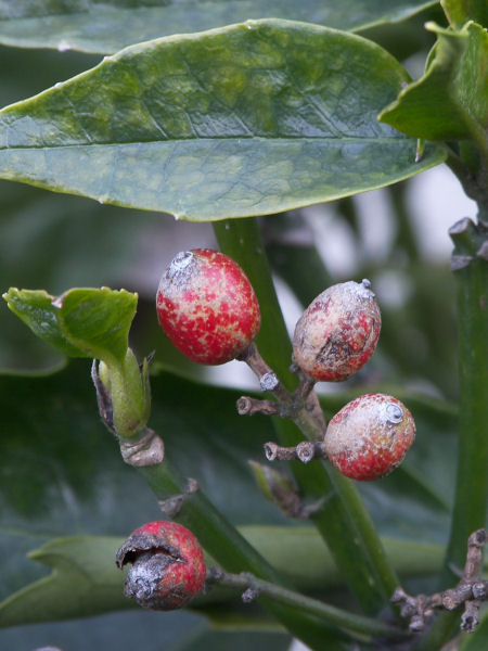 今日の写真はアオキの実だろうか? 雌雄異株らしく、同じ敷地に数本のアオキが植わっているが、実を確認できたのはこの一本だけ。秋口にはもっと真っ赤で奇麗な実だったんだろうけど、霜が降りるようになったせいか かなり汚い果皮になってしまった。 | |