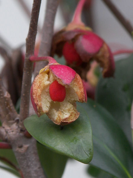 今日の写真は、モッコクと言う木本の実(だと思う)。しばらく前から直径 1Cmほどの実が色づき始めていたが、その赤くなった果皮が裂開して中に見える種はそれ以上に真っ赤。何となく梅干しの種を思い出してしまった。 | |