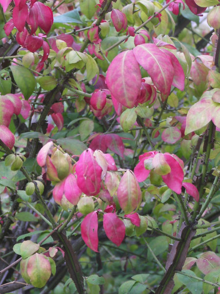 今日の写真は紅葉してきたニシキギの葉。台風の来る前の撮影だが。 | |