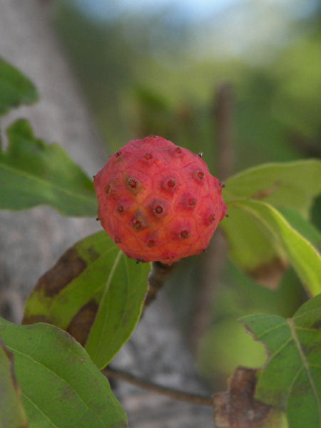 ヤマボウシの実。何となく野イチゴに似たボツボツした感じの実だ。 Webで調べると、食べられるらしい。そのまま生で、ジャムや焼酎漬けでもいいらしい。目にも効くとか・・・・でも、この木になっているのは見た限り十数個。街路樹だから採るわけにもいかないが、採ったとしてもとてもジャムにはなりそうもない。 | |