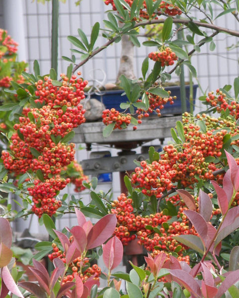 実の写真。 ピラカンサが色づき始めている。鳥たちもまだ美味しくないから食べないのか、他においしい実があるうちは食べないのか、雪が降る頃までは赤い実が付いている。 ところで、昨日書いた木の実の食味の話。ピラカンサは食べられるんだろうか? Webで調べると、 少ないながら情報はある。何事も自分で試してみないと気が済まないと言う敬愛すべきご仁がいるもんだ。その記事の中の 引用ページ。赤くなりたてだと、かなり酷いことになるそうだ。さすが青酸系の毒。そのうちサスペンスドラマの手口に登場するかな?・・・・イヤ、舌に触れた途端に刺激感があるらしいから嫌がらせ程度にしか使えないナ。・・・・などと想像を逞しくしてしまった。 どうやら、赤くなっても暫くは青酸系の毒があるらしい。一遍に大量に食べると痺れや下痢などの可能性があるらしい。それが雪が降る頃になると薄くなって少しなら食べても害はなくなるらしい。鳥たちもそのあたりを心得ていて食べているようだ。何という知恵だろう。人間なら先人から言葉で伝わってくるが、鳥は言葉などでは伝えられないし、ピラカンサの実が赤くなる頃は巣立って親鳥とは離れてしまっているだろうから きっと DNAの中でそうした知恵が継承されていくんだろう。そうした知恵の情報までが詰まった DNAと言うのは究極の記憶媒体で、それを親から子へと継承していくために複製したり、その DNAからこの実はまだ食べられないとかもう食べてもいいと言う情報を日々の行動に再生するシステムと言うのは何と素晴らしいシステムなんだろう。 | |