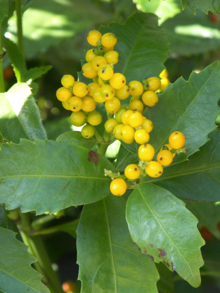 写真は黄色いセンリョウの実。赤いセンリョウに比べると見ることは稀。赤いほうが縁起がいいからだろうか? センリョウは美味しくはないが毒もないとか。鳥はまずセンリョウを食べ、センリョウが無くなったころマンリョウを食べるらしい。 | |