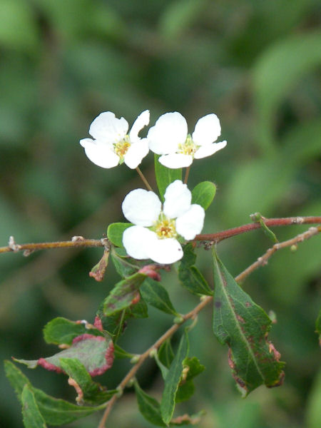 今日の写真は4カ月ほど前に咲いた花が戻り咲きしていた。キョウカノコだと思っていたが、良く調べると冬には茎が枯れてしまう草本ではなく木本だからシモツケかな? キョウカノコやシモツケソウは葉っぱが手のひら状に5~7裂するらしいけど、この花は長細い楕円だし。ついでにシモツケソウには茎に小さなとげがあり、キョウカノコには無い・・・とアチコチに書いてあるが、写真がないのでどんな棘か分からない。 | |