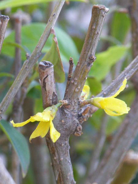 枯れ枝の中、地面近くに小さな黄色い花が何輪か付いていた。よく見るとヒュウガミズキのようだ。5月頃に咲いた花だが、またえらく遅くなって戻り咲きだ。 | |