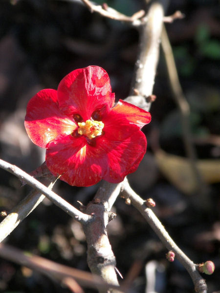 今日の写真は木瓜の花。実も随分前に落ちたのに戻り咲なんだろう。枯れ枝に昨夜の雨に濡れたせいで一段と鮮やかな花弁だ。 | |