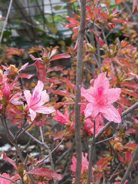 一面枯れたツツジの木の間に、一本だけ花の付いている木がある。紅葉した葉っぱとピンクの花の競演で見事。 ちょと珍しい光景。 | |