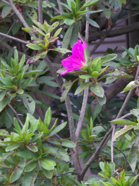 今日の写真は、昨日の写真と同じツツジだがこちらはまだ葉っぱは紅葉していない。2m以上もある大きな木に2輪だけポツンポツンと戻り咲のような花がついている。今日あたりから一段と寒くなるようだから、折角咲いたこの花も見納めだろう。 | |