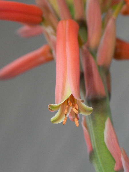 今日の写真はアロエの花のマクロ。 細い筒状の花の先が開いて、蕊(シベ)が見える。どれが目蕊でどれが雄蕊なのかは??? | |