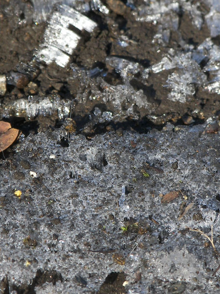 今日の写真は落ち葉と霜柱。通学の小学生か中学生が面白がって踏んだんだろう。見事な氷柱が見えていた。 | |