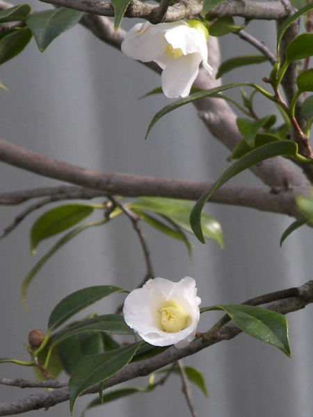 小さな侘助というツバキの種類(だと思う)の白。 白侘助と言うらしい。真っ白い花は何か高貴な感じがする。 | |