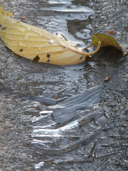 今日の写真は、今朝の初氷。TVニュースでは各地が暴風雪で大変な状況らしいが、Webで調べるとこの辺りも今朝は-2℃といよいよ氷点下になったようだ。 | |