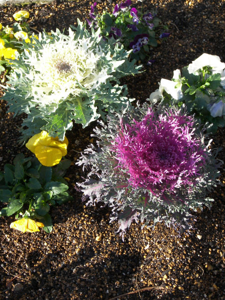 今日の写真はハボタン。葉が縮れた珍しい種類。若干紅白を意識して植えたのだろうか?子供が小さい頃、隣家の鉢植えを見て「どうしてキャベツの葉っぱに色が付いているの?」と聞いたとか。多分誰かが絵具か何かでいたずらしたんじゃないかと勘違いしたんだろう。 | |