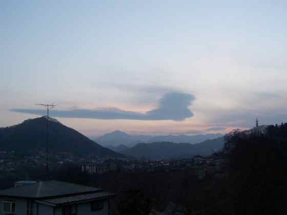 我が家は今日から、正月明けモードでした。 お父さんはもっぱら出勤、通学のアッシー君です。 年末に、このページを記入している cgiプログラムのバグの指摘がありそれを 約1日掛かりで修正して、ついでに若干の機能改良を施しました。その顛末記をまたアップしました。詳細はそちらをご覧下さい。 アッシー君のついでに、空を見上げていて気付いたのですが、ほぼ午後一杯、同じ所に同じ形の雲が浮かんでいました。他の場所はいつも通り時間と共に変わっていくのに、この雲の細長い部分だけはここにずーっとこの形で出ています。風も殆ど無かったのでたまたま、地形の関係か何かで、ここにはこんな雲が出やすいのかもしれませんが。 昨日「今年の正月は何も無く明けた」と書いたばかりですが、何も無ければいいなと思いつつ、ちょっと気になったので写真をアップしておきます。