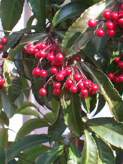 昨日の続きで、携帯電話の技術進歩の話です。 自動車用移動電話が実用化され、家庭内のコードレスホンも普通に使われるようになっていた頃には、符号化技術や無線技術・交換機技術などのアナログ通信の基本的な技術は既に揃っていたことになります。でも、私が現在の携帯電話の世界を予想できなかった一番のポイントは電源容量の問題でした。 自動車のような、大きな電源が一緒についてくる場合や、家庭内コードレスホンのような使わないときはいつも充電状態にある装置の場合は、電源容量はそれほど問題になりません。しかし、個人が長時間外出時に持って歩くような電話の場合、何時掛かってくるか分からない電話を待ち受けるために、受信回路は電池のパワーで常に動作している必要があります。しかも 例えば 090-1234-5678に電話をかけたときに、その電話を呼び出すために日本中の全ての基地局から 090-1234-5678を呼び出すわけにはいきません。勿論基地局を順番に呼び出していったのでは、呼び出し音が鳴るまでに時間が掛かりすぎます。そのために一定時間ごとに、自分がどこにいるのか、発信しておく必要があります。 つまり、携帯電話は常時受信回路が働き、一定時間ごとに発信を繰り返している訳で、このための電力を賄う電池は普通考えるとコードレスホンとは比べ物にならない位、相当に馬鹿デカいモノになってしまいそうです。1週間旅行していても、充電しないで使える電話なんて夢のようでした。それが今や奇麗なフルカラーLCDがついてもシャープペンシル3本分くらいになってしまっています。 実は、私が会社に入っての初仕事は、カメラの電池の残量表示回路を設計することでしたから(当時のカメラは水銀電池と言う、環境に極めて良くない、1円玉2-3個分くらいの小さな電池を使っていましたが)、この電池容量の問題と言うのは、非常に興味があるテーマだったんです。 今日の写真は、寒さが本格的になって赤さが一段と増したマンリョウの実です。間もなく鳥に食べられる季節だと思いますが、まだ指で潰すと少し硬いようです。一応 千両・万両の「マンリョウ」ですから、正月に相応しいおめでたい植物なんでしょうか。