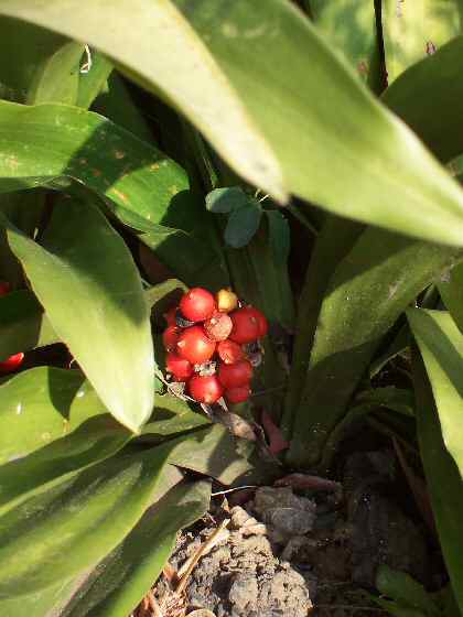 技術の将来予想を出来なかった話の続きです。 今回の話は製品からはちょっとずれていますが、部品です。 携帯電話やデジタルカメラの中に使われている、不揮発性のメモリであるNANDフラッシュメモリについてです。 このNANDフラッシュは、1980年代の終わり、東芝で発明されたものです。発明者の一人である N技師長は私が技術者として尊敬している方で、幸運にも年2-3回は酒席にお誘いをいただけるのですが、私は奇しくもこの発明のニュースがラジオで流れたのを今でも憶えています。丁度 不揮発性のメモリを使用した自動調整の技術を実用化した後でしたのでこのニュースに興味がありましたが、そんなメモリの用途が果たしてあるんだろうかと通勤の車を運転しながら疑問に思ったものでした。(メモリと言えば、1ビットずつ読んだり書いたりすることが出来るランダムアクセスメモリ(RAM)が主流の時代でしたし) しかし、デジタルカメラなどの発展で、発明から 15年した今、半導体メモリ市場は大きく育ち、特にNANDフラッシュメモリは東芝の現在の半導体事業の柱になっています。デジタルカメラがまだほんの実験機に過ぎない1990年ころに、いずれ半導体によるファイル用メモリが半導体の一角をなすだろうと読んで、社内の反対に逆らって技術の改良に心血を注いだ慧眼には感心しています。 今日の写真は 赤く色付いた万年青(オモト)の実です。