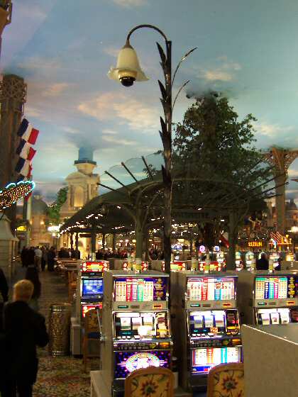 5日間ほど、LasVegas の CES(コンシュマーエレクトロニクスショー)に出張に行ってきました。ショーは、Hilton Hotelのコンベンションセンターで行われるのですが、LasVegas というとカジノのギャンブルを連想し、24時間眠らない町のように思われがちですが、今回私が泊まったのはLasVegasの中心から車で 40-50分ほど離れた岩山の中のリゾートホテルでした。岩山の中とは言っても、そこはアメリカのリゾートですから ちゃんとそこだけは緑があるのですが、回りに見えるのはやはり赤茶色の岩山だけです。夜中に、月明かりに照らされた光景は、岩陰からコヨーテが出てきても不思議でないような風景です。 折角の LasVegas ということで、一晩だけは 市内のレストランで食事をして、カジノも覗きました。そこで気付いたのは、カジノの天井が非常に高く、空の模様が描かれているんです。日本で行けば初夏の夕暮れ少し前のような感じでしょうか。非常によく出来ていて、ビルの中に入ったはずなのに不思議な感覚に襲われます。どうもこれは、時間を忘れさせ夜遅くまで(朝早くまで?)、ギャンブルを続けさせようと言う魂胆かもしれません。実際、夜の10時頃行ったのですが、時計を見ないと時間を錯覚しそうでした。 今日の写真は、このカジノの風景です。右奥の柱が空を支えているのが分かりますか?