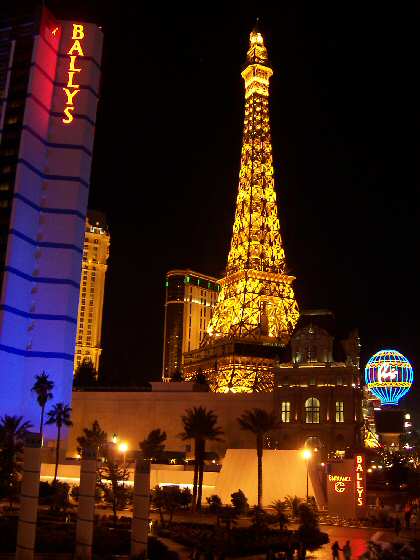 もう一回 LasVegasの話です。 LasVegas という町は、グランドキャニオンのコロラド川をダムで堰き止めて出来たフーバー湖から砂漠の地に水を引いて灌漑した町です。本当に町の周りは砂と岩山だけ、飛行機で飛び立った後を見ると、町のすぐ回りは岩山で、高い山の頂には私たちがつく前の日に 5年ぶりに降ったと言う雪がまだ残っていました。 もともと砂漠ですから、鉱山や農業など全く産業が無いのですが、そこに水を引いて町を作って、ギャンブルを産業として全世界から客を呼んでギャンブルをさせ、客が勝ったら客から、負けたら店から税金を徴収して、産業の乏しいネバダ州が潤っていると言う、石原都知事が真似したいと言い出した町です。 今日の写真は、昨日の写真のカジノの外側、パリスホテルのエッフェル塔の写真です。このエッフェル塔の下がカジノの町並みになっています。
