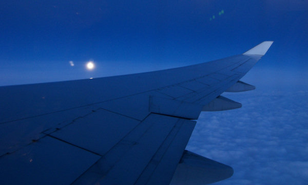 帰りの飛行機は、4時間遅れての出発。 おまけに窓側シート。疲れた帰国でした。 家に着いたのは夜 11時ちょっと前。 退屈な飛行機の中、ふと気付くと夜空に綺麗な満月が 主翼の上に見えました。 雲は遙か下の方に見ながら寒そうに皎々と輝く 月が印象的でした。