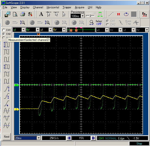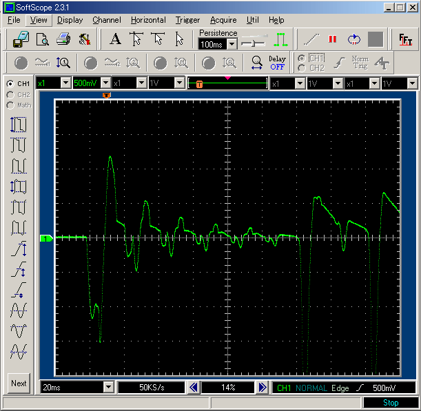 時間軸が、最初の波形の倍になっていますが、どうやら突入電流が一旦収まりかけて、再び突入電流が半波だけ流れているようです。この半波の電流がフューズ断と関係ありそうです(後から気づいたのですが、このときのオシロのプローブのカップリングがACになっていたので、この波形では完全な半波にはなっていません)。半波しかトライアックがONしていないと言うことになれば、当然、フォトMOSリレーの電源になっている C101のチャージが不足している事が原因でしょう。そこで、C101の両端の電圧波形を観測します。