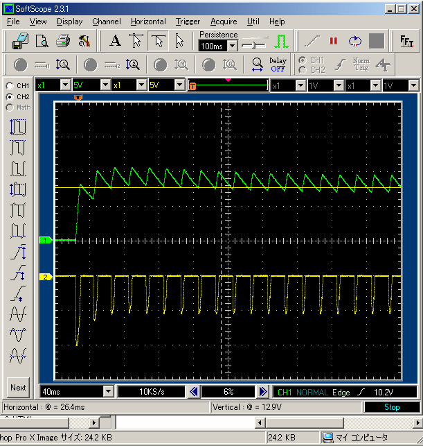 直列抵抗は2.5Ωを入れ、プローブは 10:1 を使っていますので、突入電流は 10A弱流れているようです。(直列抵抗がなければ、多分 その倍は流れている可能性もあります)