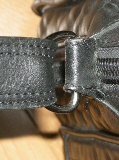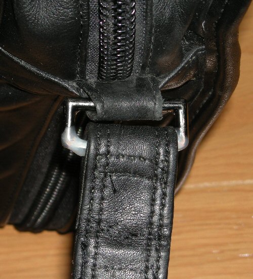 ![]() 最後に、一旦縫い目を解いたベルトの端っこを、金具に通して再び縫い合わせます。結果は下の写真のように接着剤が若干はみ出しましたが、強度的には問題の無いベルトが出来上がりました。最初から接着剤がこんなにはみ出すのが分かっていたら、接着剤には黒いトナー粉末でも混ぜて目立たないようにしたのにと思ったんですが、すでに硬化した「後の祭り」でした。(写真は拡大しているので、接着剤の白い色が目障りですが、実際はベルトに隠れてそれほど見えません。) ![]() 反対側は 元からあった半円形の金具を残して、そこにベルトを通しただけです。 写真でも分かる通り、元のベルトは金具のフックの部分で取り外しが出来ましたが、今まで一度もつりベルトを取り外した事はないので、余分な機能よりも信頼性を重視しました。 もし皆さんもバッグを買うときは、ベルトの金具までしっかりチェックして、ダイキャスト製だったら摺動部分にはきちんとワッシャの嵌ったベルトの付いたバッグを買うようにしましょう。 |