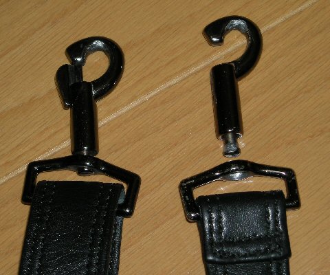 2007/12/18 ケチな割りに、PCに関連したものになるとフンパツしてしまう性格で、普段通勤に使っているバッグは3年位前に 大枚 3万数千円をはたいて購入したマルエム松崎というブランドの皮のバッグです。それまで布製のPCバッグが気に入って使っていたんですが、角の部分などが磨り減ってきたので 1万円台のバッグを散々探した挙句、どうしても気に入ったのが見つからずに、仕方なく 全皮製のこのバッグを購入したものです。 ![]() バッグ本体は、値段だけのことはあって皮の質も染めも良く、少しくらい擦ってもたいした傷にもならないので満足ですが、最初についてきたショルダー用のベルトが薄いナイロンの布製で見るからに貧弱で最初から気になっていました。それが購入後、1年と少しした頃に通勤途上でいきなりバッグが肩から落ちてしまいました。びっくりしたんですが、人通りもない路上だったので他に被害も無く、ほっとして金具を見て唖然としました。金具の結合部が磨耗して穴が拡大して抜け落ちてしまったんです。 会社についてから PCの起動を確認したら大丈夫だったんですが、値段が値段ですから 製造元の マルエム松崎のお客様相談センターに電話しました。「確認して交換するので、壊れたベルトを郵送して欲しい」と言われて送ったところ、数日後に 新しいベルトを送ってきました。(その後、有償修理とも言わずにいきなり代金 3,000円を要求する電話がありましたが、憤慨して抗議したらロハになったというおまけが付きました。)新しいベルトは今度は皮製で、見た目には高級感がありますが、金具部分は以前のものとそれほど変わっているようには見えませんでした。 そのベルトが、何と! また同じところが同じように抜けてしまいました。今度はとめ具も少し前に抜けたらしく気づいたときには見当たりませんでした。下の写真でも、抜け落ちたほうの金具の穴が磨り減って拡大し、抜けた金具のボス部分もかなり痩せてしまっているのが分かると思います。 ![]() 前回の件で、文句を言ったのにもかかわらず、しかも代金を請求されたということを思い出して、今回はもうクレームする気にもならず、東急ハンズにベルトを探しに行きました。そこで気づいたのは、普通のベルトの金具は、少なくとも回転する勘合部分にはワッシャが嵌っているか、さもなければプラスチックになっているということです。1年やそこいらでこんなに磨耗することを考えると、やはりダイキャスト同士の摺動だけという機構は無理があるということが分かりました。(その後、メカに詳しい知人に聞いたところ、亜鉛ダイキャストというのは磨耗には極端に弱く、金属やダイキャスト同士が摺動する金具は耐久性が最悪であるということを教えられました。磨耗に関しては、プラスチックのほうが耐性が高いそうです。) バッグ本体だけでなく、ベルトの耐久性試験もしっかりやってくださいよ>>マルエム松崎さん と言うことで、東急ハンズで交換用ベルトを探しつつも、金具の磨耗のためにベルトまで交換ということが少し引っかかって、金具だけ無いかと探しているうちに、またいつもの虫がうごめき始めました。ベルト金具だけの問題で 皮製のベルトを捨てるのはもったいないというふうに思い始めたのです。そこで、 既存のベルトにつける金具が無いか探しましたが、それほどピッタリなものは見つかりません。いろいろ考えた挙句、壊れた金具を加工して使うことに決めました。 まず、穴が磨耗した金具の穴部分を金ノコで切断して、バッグ本体の吊革部分を通して、切断部をヤスリで削ってそこにアルミ製の細いパイプを嵌めて接着剤で固定します。