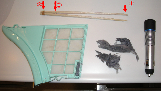 騒音の修理から2週間ほどして、今度は糸くず取りのフィルターがセットできなくなったと言います。この洗濯機はフィルターの掃除を毎回するようにしつこいくらいに注意書きがありますが、毎回と言うのはさすがに抜けることもあります。ホコリ取りのフィルターがセットできないとフィルターセットのセンサーがあるらしく洗濯も出来ません。ヨメサンはまたサービスに電話しようとしているのですが、どうも壊れたと言うよりは何かが詰まっていると言う感触ですから、ちょっと待ってもらって調べてみました。 フィルターは写真のように、洗濯槽の入り口の右上に差し込むようになっているのですが、フィルター枠があと少しのところで押し込めません。 ![]() 小さな懐中電灯(下の写真右側:秋葉原で200円くらいで売っていた車のシガーライターからの充電式LEDライト)で照らしながら、きつい姿勢で首を突っ込んで奥を覗くとどうやらフィルターの周りに溢れたホコリが奥に押し込まれて固まってしまっているようです。穴の深さが15cm以上あるので普通のピンセットでは届きません。 しばらく考えて、針金を曲げて引っ掛けてだそうかとも考えましたが、多分ホコリの塊は取れても取り出す前に穴のどこかに落ちてしまい、また余分な2次災害を引き起こしかねません。 「仕事をするのには道具が大切」という信条を持っている私は「それなら長いピンセットを簡単に作ろう」という結論に達しました。台所から割り箸を持ってきて先を少し削って細くすると同時に、少し鉤状の出っ張りを作ってゴミが引っかかりやすくします(下の写真:①)。反対側の3cmくらいのところにほんの少し凹みを作ってそこに梃子の支点となる切れ端(これも割り箸を短く切って適当な太さに削る)を挟みます(②:落ちないように片方の割り箸に接着しておいた方がいいでしょう)。最後に③の部分を輪ゴムで何重かに巻いて止めて出来上がり。 これで、穴の奥を手探りで掃除します。支点の先を指で挟んでは取り出してゴミが引っかかってくることを期待します。10回ほど繰り返したら、期待通り大きなゴミの塊が二つ取れてきました(下の写真の塊です!)。覗くとまだ少し端の方に残っていますが、洗濯槽の入り口は小さくて見ながらこの手製ピンセットが突っ込めないので諦めました。 ![]() これでフィルターをセットしてみると、見事 元通りにカチンと嵌ります。ピンセットの製作と合わせて合計 30分くらいの作業時間です。 エンジニアの意見としては、どうもこのフィルターの機構は、たとえ毎回掃除したとしても埃がフィルターの回りに漏れて今回のような事態を引き起こす可能性大です。多分、サービスエンジニアはこんなゴミ取りに何回も呼びつけられているんでしょうね。