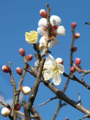今日は節分と言うことで、各地で豆まきイベントが行われたらしい。我が家でも形だけの豆まき。 毎年豆をまきながら思うことがある。この行事は、もしかして昔の人の動物愛護の表れかもしれないと。冬の餌の一番乏しい時期に外に向かって豆を投げれば、当然翌朝は鳥が喜ぶだろう。稲穂をわざと一本だけ残しておいたり、柿をもがないで残したりと、昔の人は野生動物、とりわけ野鳥に対して粋な計らいをしたものだ・・・などと考えながら豆を投げている。 一句「節分や 豆は鳥へと 遠く飛び」 それはともかく、節分と言うだけあって、冬晴れ一辺倒な天候が変わりつつあるようで、昨夜も気候の変わり目らしく濃い霧が出たが、今日日中は一旦かなり冷え込んで、逆にまた夕方になって温かい空気が流れ込んだのか、玄関辺りの石敷きは表面が濡れたようになっていた。 ジョギングでも、2周目辺りからウインドブレーカを脱がないと汗が出るほどだった。 今日の写真は、散歩道をちょっと外れたコースの垣根の上に顔を出した白梅の花。かなり早咲きの木だ。 |