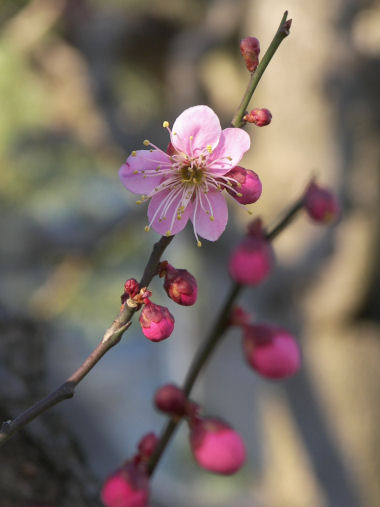 今日の写真は、これも散歩道の途中の家の垣根の上に張り出した枝に咲いていた紅梅の花。この雪で萎れてしまうかもしれないが。
