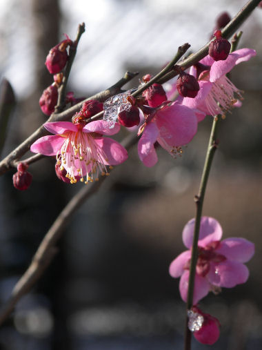 昨日の雪が一転、朝から快晴の天気。 だが、めっぽう寒い。起きた時には寝ていた部屋の窓ガラスが、この季節には珍しく結露で曇っていた。 この辺りでは、今朝の日の出前の最低気温が -3℃、今日の最高気温が 5℃程度らしいから、最高気温は普段の最低気温とそんなに変わらないと言うことになる。 雪も降って、朝日も出たので朝の散歩はカメラを持って楽しみに出かけて、何日分かの写真が撮れた。 今日の写真は昨日アップしたのと同じところの紅梅。風もあったので、積もった雪は吹き飛んでしまったようだが、氷になってくっついた分は残っていた。日差しの方角が順光気味でうまく氷が光らなかったが、寒げな花には撮れた。 |