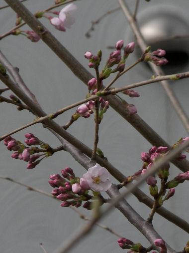 昨日の蕾の状況から & 東京で開花宣言がされたと言うニュースで、今朝は期待して散歩に。昨日の蕾を見た木をよく観察すると、日当たりのよい高い枝の所々にほんのタマに咲いている花を見つけた。気象庁の開花宣言は標準観察木の枝の 5輪が咲いたことで「開花」と宣言するらしいから、この状態はまだ開花ではないかもしれないが、きっと夕方にはもっと咲いているだろう。明日が楽しみ。
