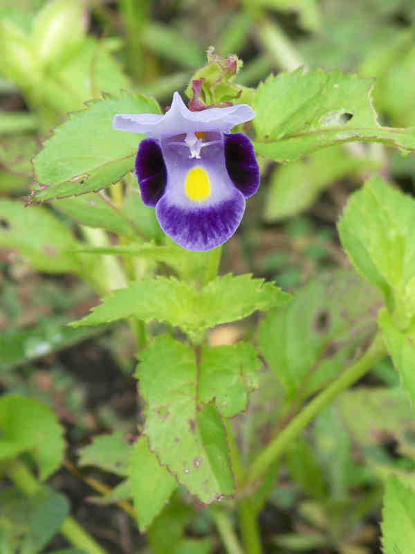 空き地に珍しい花が咲いていた。Webで調べるとトレニアと言う花かも知れない。載っている情報よりは随分小さな花だが雑草の中で養分が足りないんだろうか?