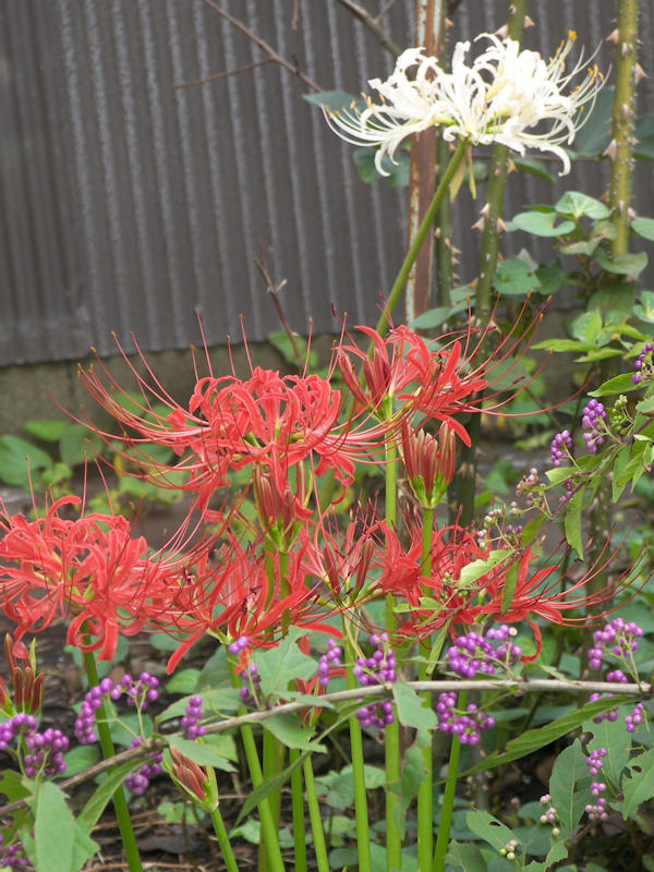 ガラケーを遅まきながらスマホに変えて1年強。ご多分に漏れず最初の頃はアレコレいじっていたが、最近はメールやLINE、時々 外出先で Web検索や地図表示など以外には使わなくなった。家では何かしようとするとやはり馴染んだ PCに頼ってしまう。 それが最近、一つだけ便利なアプリを見つけた。夏場は局地的な雨が多く、出先で自転車だったり歩きでも傘がないため、暫く雨宿りするかズブ濡れ覚悟で強行突破するか はたまた大枚をはたいて傘を買うか・・・・など悩むことも多い。そんな時、「PCでは雨雲レーダーが見れるんだから・・・」と思って探したら やはりあった。該当アプリはいくつもあるみたいだが、インストールしたのは 「Y!天気」。今朝も不安定な空模様だったが、雨が降り始める1時間ほど前に「雨雲接近」情報がバイブ通知で着信して、見ると小田原の南側にかなり厚い雲があるらしいとわかった。動画表示で雲の移動状況が-1時間 ~ 6時間後まで表示されるので、その雲がどう移動してくるのかも分かるから本当に短時間・局地的な豪雨なのか、暫く降り止む気配がないのかなどかなり正確に知ることが出来る。 お陰で、ここ1ヶ月の間に すでに2回ほど雨宿りなどで雨をやり過ごして濡れずに済んだ。出かける際にも、駅まで歩くときなど今すぐ出掛けたほうが良いのか、少し待てば小降りになりそうかなど、結構役立っている。ま、分かっても現役時代なら忙しくて雨宿りで時間つぶしなど選択肢に入らなかったから、暇な年寄りならではの使い方とは思うが。 今日の写真は季節感バッチリの写真。赤白のヒガンバナとムラサキシキブの実がうまいことワンシーンに収まった。 |