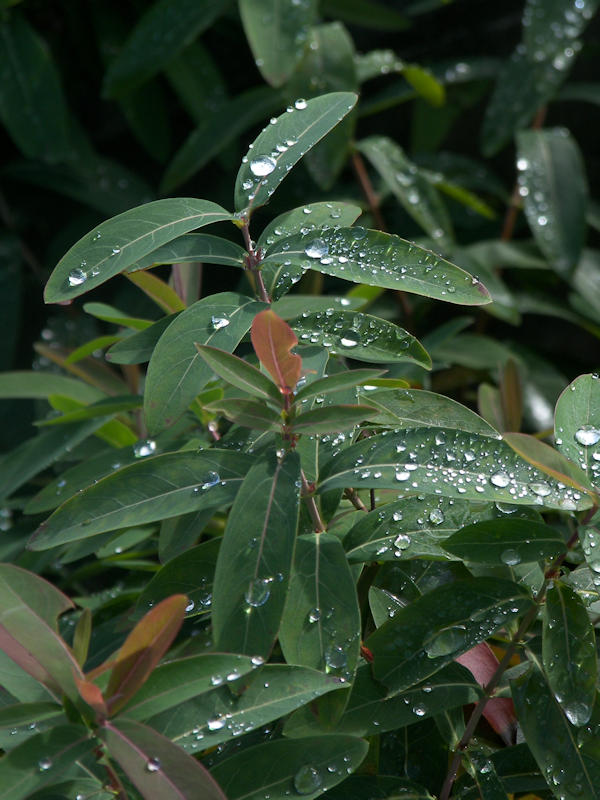 昨日の雨から一転、今朝は快晴。ビヨウヤナギの葉に溜まった雨露が日に光って綺麗だった。