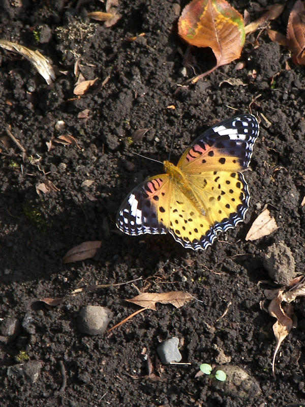 寒くなってきて活動量が落ちたのかこの写真は羽を広げているところを比較的近づいて撮影できた。今までアカタテハ蝶だと思っていたが、Webの写真と比較すると同じタテハチョウの仲間だが、ツマグロヒョウモンという蝶のメスらしい。成虫のまま越冬するらしいが、今年はもうこれで見納めかもしれない。