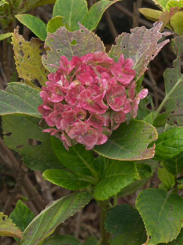 写真は何とも季節外れの紫陽花の花。花びらも紅葉したような色。
