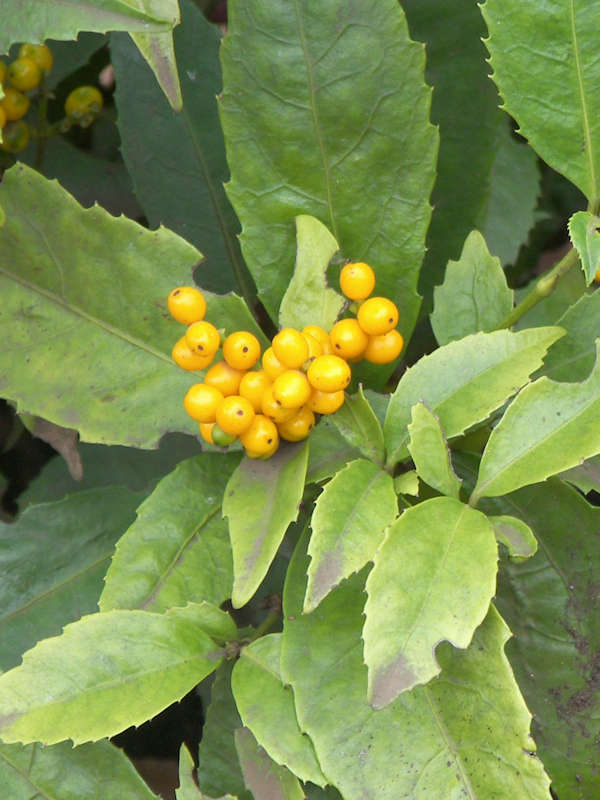 センリョウ・マンリョウのこれはセンリョウだと思う。実が垂れていないから。黄色いセンリョウは珍しいが、単に赤より目立たないだけかもしれない。