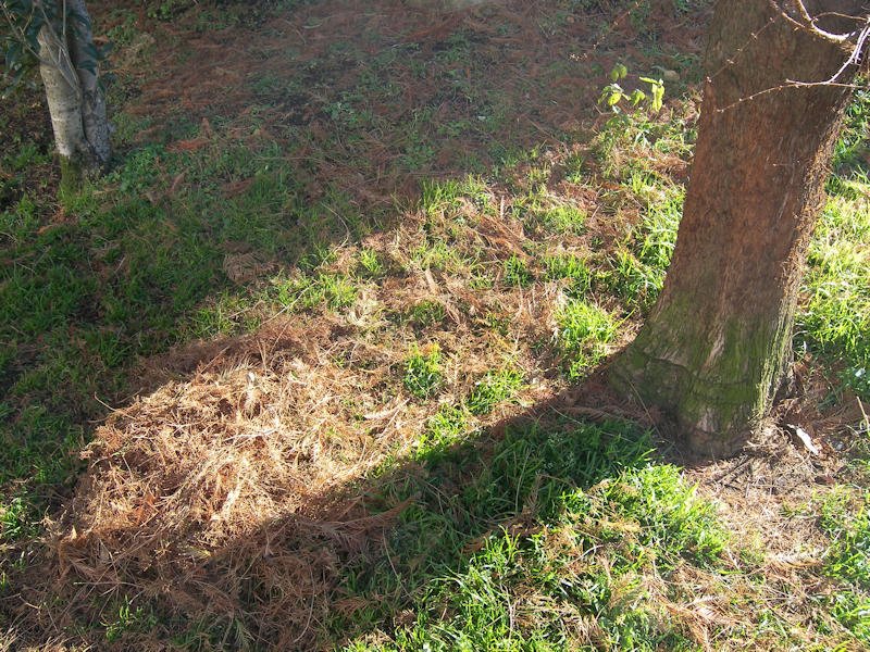 昨夜 まだ元旦だと言うのに帰省のUターンラッシュなのか若干の停滞の中 我が家に戻って、今朝は朝の散歩を再開した。晴れてはいるものの日は薄く、寒々しい。そんな雰囲気が写っているかどうか分からないが、ヒマラヤスギの枯れ葉の散り敷いた根本に射す斜陽を撮ってみた。気温のせいだろうか? この辺りではまだかなりの種類の緑のものが残っている。