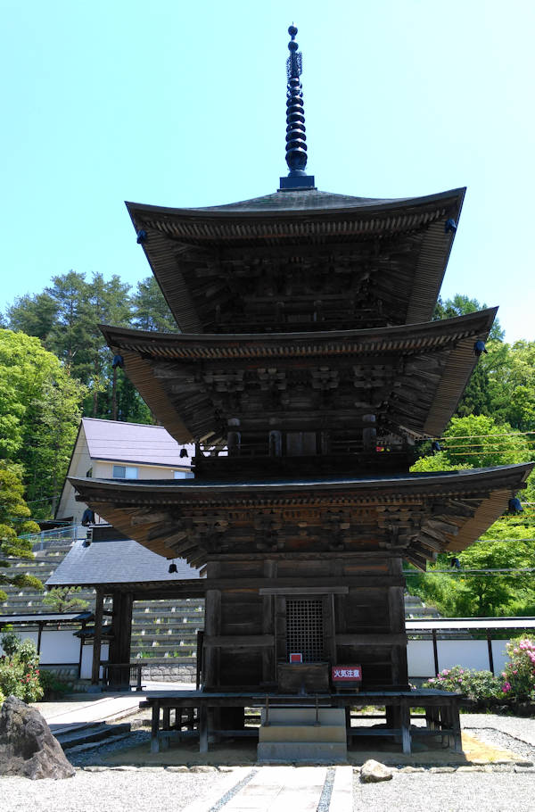 古くからの知人のA氏に誘われて蕎麦食いに小川村~美麻村方面に。美味しい蕎麦やお焼きを食べながら遠望の北アルプスと新緑を楽しんだ。写真は途中の高山寺という古刹の三重塔。千二百年前に坂上田村麻呂による創建で、この三重塔は800年前のものだという。
