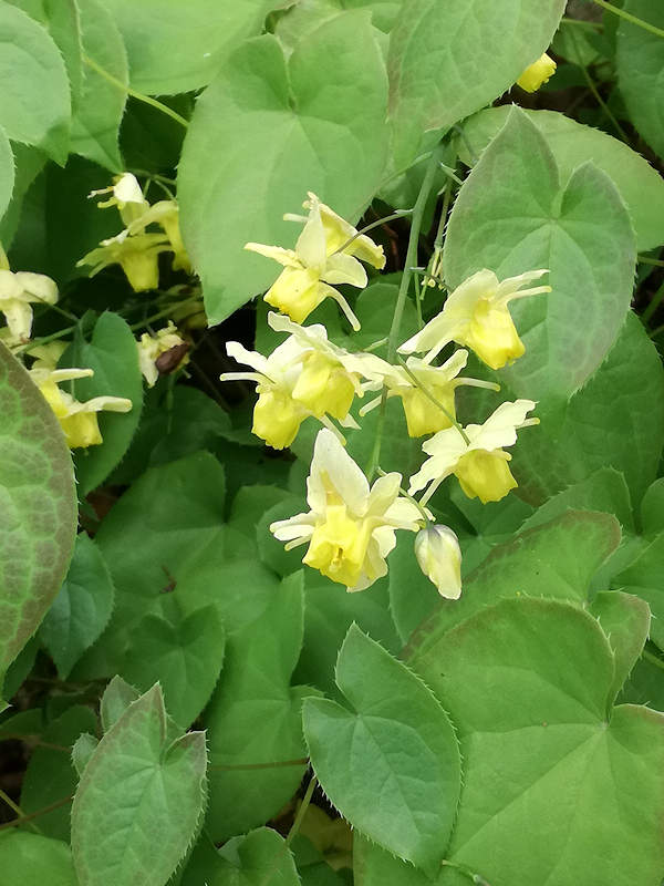 今日の写真は岡谷にいる間に散歩コースにしている出早公園に咲いている珍しい花。形は「バイカイカリソウ」に似ているが Webで調べると白色の花で近畿以西の温暖地域となっているので違いそうだ。花色や分布データからすると「キバナイカリソウ」かも知れない。 |