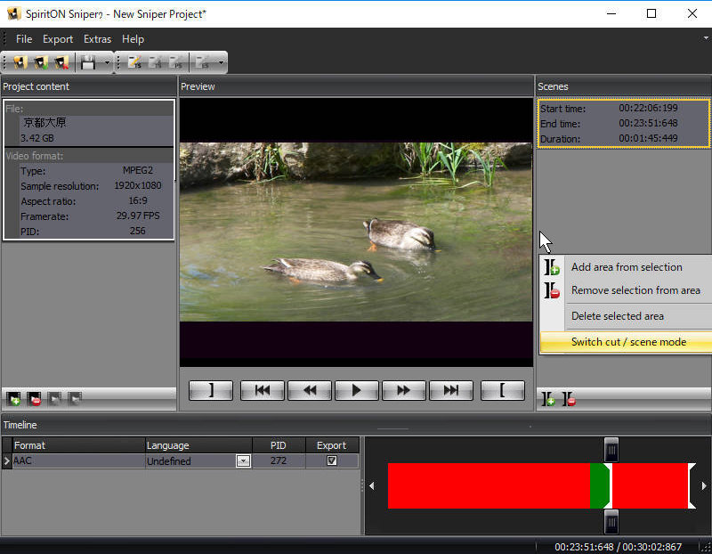録画ファイルなどの処理でしばしば動画のカットを使いたくなることがある。その際 圧縮されたストリーミングデータをデコード>再エンコードしないで、ビデオ/音声共に必要部分だけのストリーミングデータを切り出してくれるアプリがいくつかある。(再エンコードしなければ処理時間が極端に短く出来る) 主に使っているのは Avidemuxと言うアプリだが、何故か時々出力ファイルがエラーで短くなってしまうことがある。 そんなファイルを別のアプリで切り出してみようと、かなり昔にダウンロードしてあった TSSniperと言うアプリがあるが、これが何故か今まで使えなかった。海外製アプリだが Webの日本語説明ページを頼りに使おうとしたが、イマイチ説明通り範囲選択できなかった。「]」(始点)や「[」(終点)の範囲選択ボタンを押しても何の変化もなく、選択範囲が赤くならなかった。 今日になって、再びカットしたいと思って使ってみたところなんとか使えるようになったので忘れないうちにメモ。要は画面右ペインの「Cut」と言う部分で右クリックして「Switch Cut/scene mode」を選んでから操作するのがポイント。そうしておいて選択範囲の先頭~末尾 を選択してから画面右下のカットボタンを押してカットするということ。 その他にも、ターゲットの動画ファイルを読み込む際に「New Project」を作成してからファイルを D&Dして開くとか、処理結果のファイルを出力するのに「ファイル」メニューからではなくて「Export」メニューの「Export transport stream」を選択するなど、かなりクセのあるアプリだ。