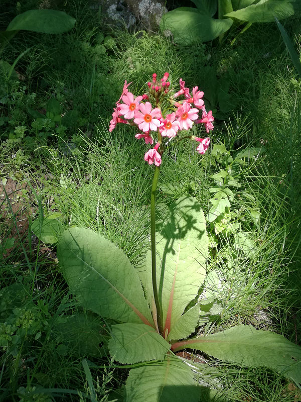 気づいたらこの e日記の記事が 2000件を達成した。この e日記を始めたときは新しもの好きで飽き性な私が三日坊主にだけはなるまいと思ったくらいで、2000件に達するとは自分でも思っていなかった。始めたのは 2003年10月だから、足掛け 15年近くかかったが 133件/年、≒ 1件/3日 というとそこそこの更新回数になる(少なくとも自分ではそう思っている)。 そもそも始めたのはフリーの日記の CGIプログラムを自分好みに改変するアイデアからで、その後も改造のアイデアが浮かぶたびに追加・修正を繰り返し、もはや元のプログラムは一部のサブルーチンくらいしか形を留めていない。 今日の写真はこれも出早神社のせせらぎの脇に咲いていた。葉っぱの凸凹が若干違う気がするがサクラソウ? 木漏れ日に浮かび上がって神秘的な雰囲気だ。 (後日追記:大きさや生えている場所からサクラソウ科サクラソウ属のクリンソウかと思われる。) |