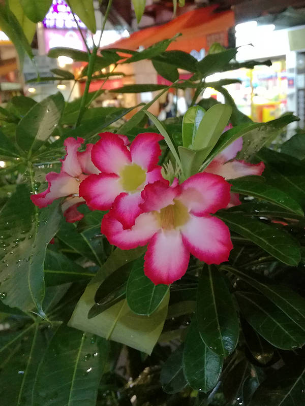 今回、突然台湾に出かけることになった。切れたパスポートを申請し直したり、直前の航空券手配と今までは誰かにお願いしていたことを全部自分でやらなければならず、現役時代の庶務のありがたさを身にしみて感じた。 十数年前に台湾に行った時は最初の訪問地が台北だったためか、台北(松山)空港発着便を利用していた記憶があって、しかも出発が近い羽田発便を探すと台北空港はそこそこの時間帯があるのに桃園空港には朝5時台の便しか見つからず、迷わず台北空港発着便を予約した。その直後、先方から桃園空港便をとるように連絡をもらって「そうか、成田からなら通常時間帯であったのかも?」と思ったが、すでに予約済みで変更が面倒なのでそのまま出発した。それでも宿泊地の新竹と台北の距離が昔の完全送迎付きの記憶ではあやふやなので事前に交通手段などを詳細に検索して出かけた。昔はこうした情報は旅行案内書しか無かったが、今は Webで溢れるほどの情報(真偽の程はともかく)があって、場合によってはQ&A掲示板などでも聞けて便利だ。 結果、先方からは空港-台北駅を在来線乗り継ぎで移動するような案内が来たが、台北空港から高鐵(台湾新幹線)の台北駅まではタクシーで移動、台北駅から新竹駅までは高鐵、新竹駅からホテルは徒歩5分弱なので夜中到着だったけれど無事到着。ただ誤算だったのは、予約してくれたのが結構大きなホテルだと思っていたのに、駅から夜景を探しても街には然程ネオンの光があるわけでもないのに「Hotel」らしい明かりは見つけられず、おまけに通信手段としてフリーの WiFiである iTaiwanの登録を国内でして出かけたのに、台北空港のトラベルセンターでアクティベーションするのを忘れてしまったので新竹到着時にはインターネット利用が出来ず、イザという時はGoogle Mapでホテルまでと考えていたのに Google Mapが使えなかったこと。やっと探し当てたコンビニで道案内してもらって無事到着してわかったことは目的のホテルの建物は「雑居ビル」で、13階までが別の会社が入っており、14階以上がホテルなので建物外壁にはホテル名の看板はなく入り口に控えめな案内板があるだけ。1Fにもロビーはなくてだだっ広いフロアーの片隅に守衛がいるだけなので直ぐそばを通りながら別の建物だと思って気づかなかった。 2日ほど打ち合わせして、最終日は台北に戻って故宮などを駆け足見物して台北のホテルに宿泊、翌朝一番の便で戻ってきた。 今日の写真は台北市内で食事した際、目の前にきれいな花が咲いていた。調べると「デザートローズ」と言うキョウチクトウ科アデニウム属で東アフリカ原産の花らしい。確かに花はそう言われると、という程度だが葉っぱだけ見るとキョウチクトウに似ている。 |