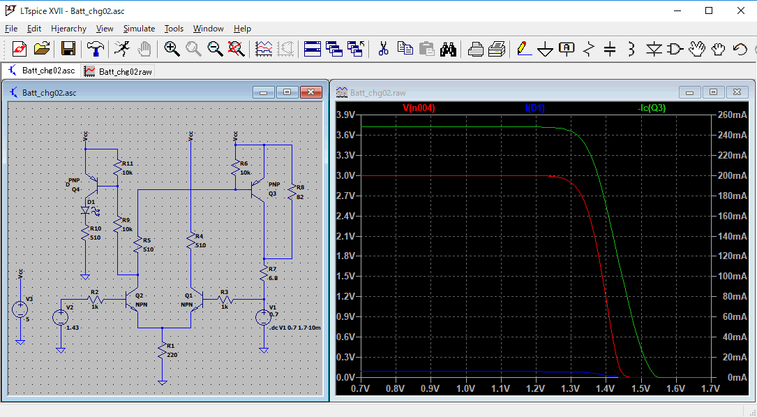 右図はNi-MH充電池の充電制御をアナログ回路でやったらどうなるかというシュミレーション。満充電まで0.2C程度の電流で、その後 0.1C程度で補充電する仕様をシュミレーションしたもの。上で触れたように Arduinoなど A/D変換までチップに搭載した多機能 MCU全盛の時代に無意味なシュミレーションだとは分かっているが、パソコン画面上だけで簡単にシュミレーション出来るとわかったので敢えてトライしてみた。