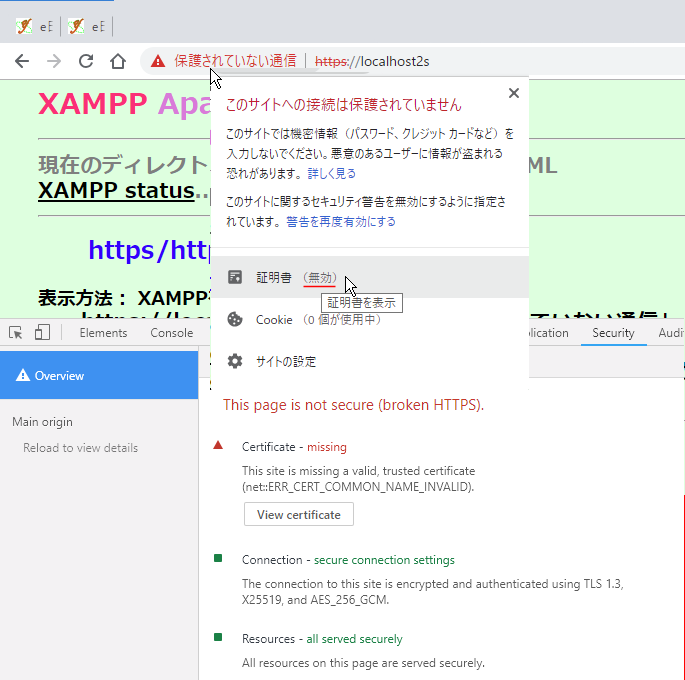 ・・・・でもローカルでSSL化するのは何のため? 決済ページを立ち上げる予定もないのに。Webサーバーを SSL化したのでこの際ローカルも・・・と思ったが、「保護されない通信」のままでも途中経路が暗号化されていようといまいと PerlやPHPといった SSIの動作確認などは別に問題無さそう!? 所詮 PC内の通信だから傍受・改竄される心配もないのに、思いついたらやらずにはおれない性格が悲しい(涙;;;)