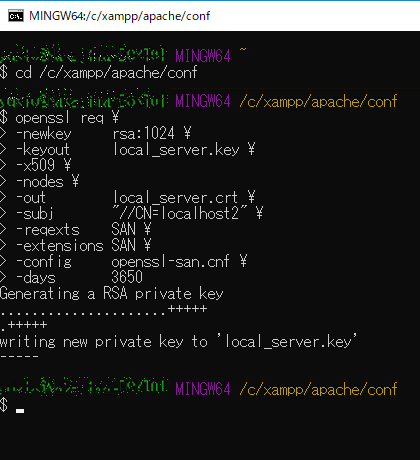 証明書の作成は GitBashでこんな感じ。